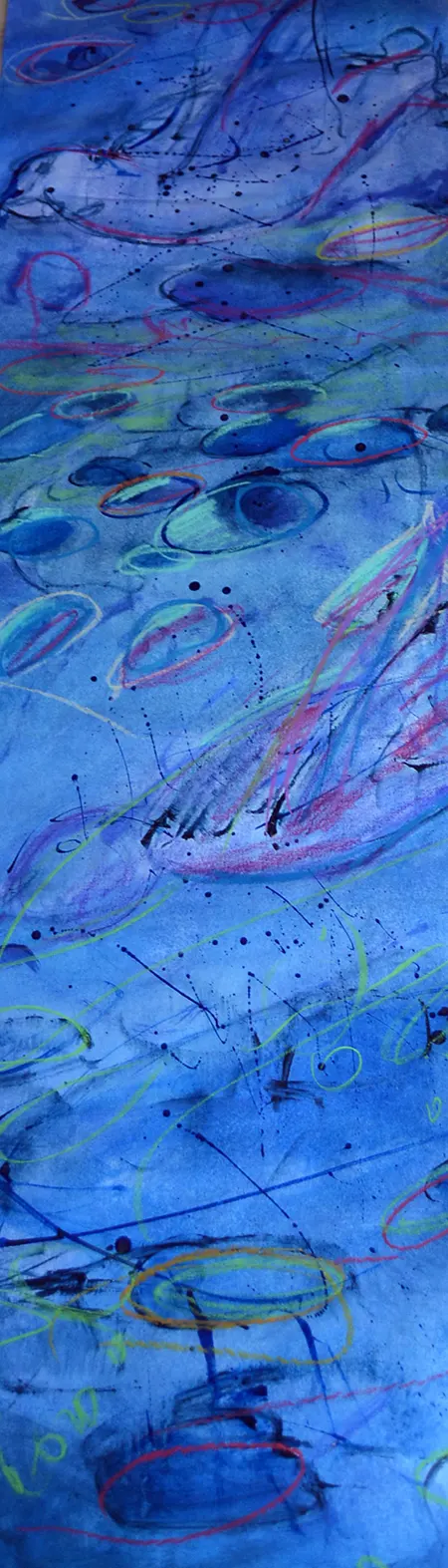 Her paintings and graphics are expressive in colour and form, translucent and vary in nuances and tones. The transitions can be either intense or very fine. Combinations of colours and lines continuously blend into each other and constantly create new impressions. A silent dialogue is initiated with every newly coloured surface and every newly drawn line. Like in a movie, images are strung together, by that continuously change the composition of the painting or the graphic. It is this kind of evolution and progression that renders the creative process a stimulating and exciting experience.