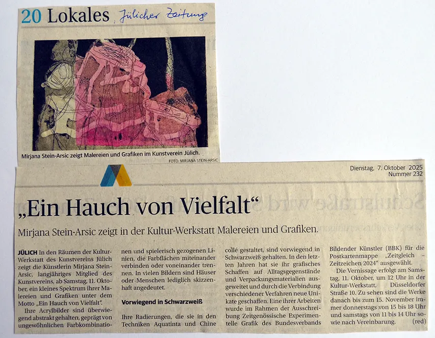 View Larger Image Ein Hauch von VielvaltTumke2025-10-08T14:28:16+02:00 Ein Hauch von VielvaltJulicher-Zeitung Ausstellung vom 11.10 – 15.11.25 Verissage am 11.Oktober, 12 Uhr Mein Werk Related Projects WIR im Kulturwerk Aachen Gallery WIR im Kulturwerk Aachen LICHTfall Gallery LICHTfall Alltagsgegenstände Gallery Alltagsgegenstände Offene Ateliers 2025 Gallery Offene Ateliers 2025